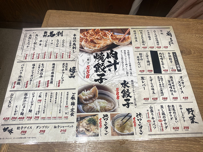 看板メニューは何といっても「肉汁焼餃子」。皮はパリッと香ばしく、ひと口かじれば中から溢れ出す熱々の肉汁が、口いっぱいにジューシーな幸せを運びます。また、土鍋で豆腐が丸ごと煮込まれた「俺達の麻婆豆腐」や新鮮な馬刺しなど、脇を固めるサイドメニューも主役級の存在感。