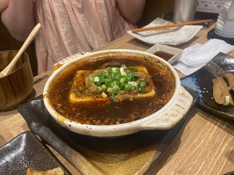 そしてインパクト抜群の「俺達の麻婆豆腐」。土鍋いっぱいに煮えたぎる真っ赤な麻婆の中に、豆腐が丸ごとドンと入った豪快なビジュアル!山椒が効いたピリ辛スープに豆腐を崩しながら食べると、食欲が一気に加速します。ご飯と合わせればもう箸が止まらない一品です。