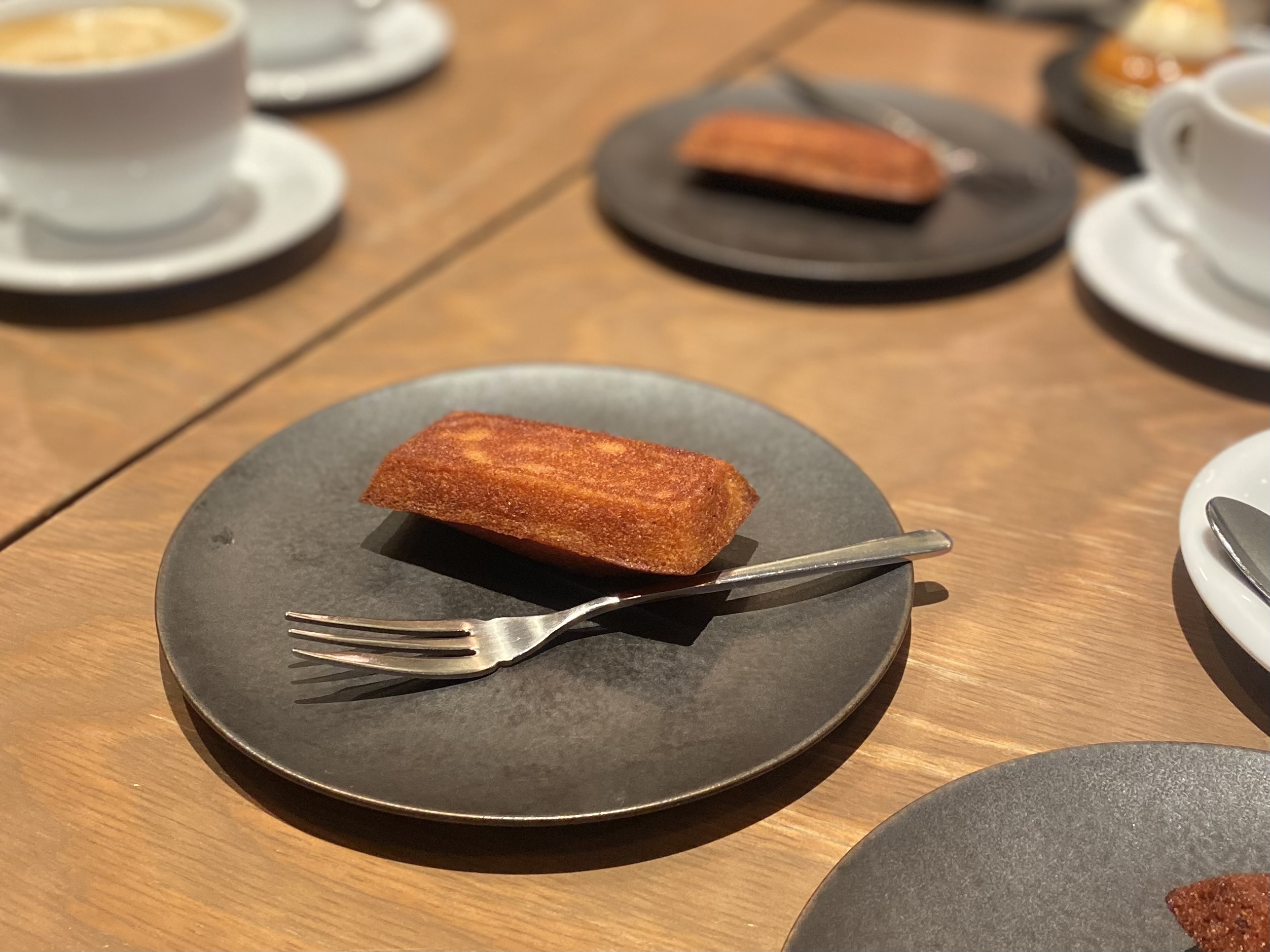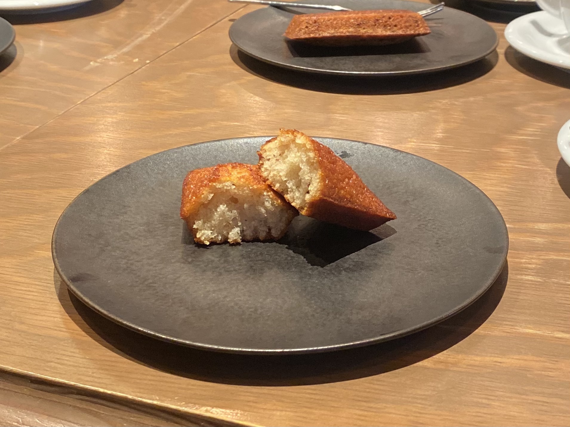 まずは「フィナンシェ・ブーレ」。表面がバターで艶々と光り、ふっくらとした立体感のあるフォルムが印象的です。ナイフを入れるとほのかなバターの香りが立ちのぼり、口に運ぶと外は香ばしく、中はしっとり。焼きたての時間には伺えませんでしたが、リベイクして提供してくれたおかげで、あたたかく香り高い仕上がりでした!