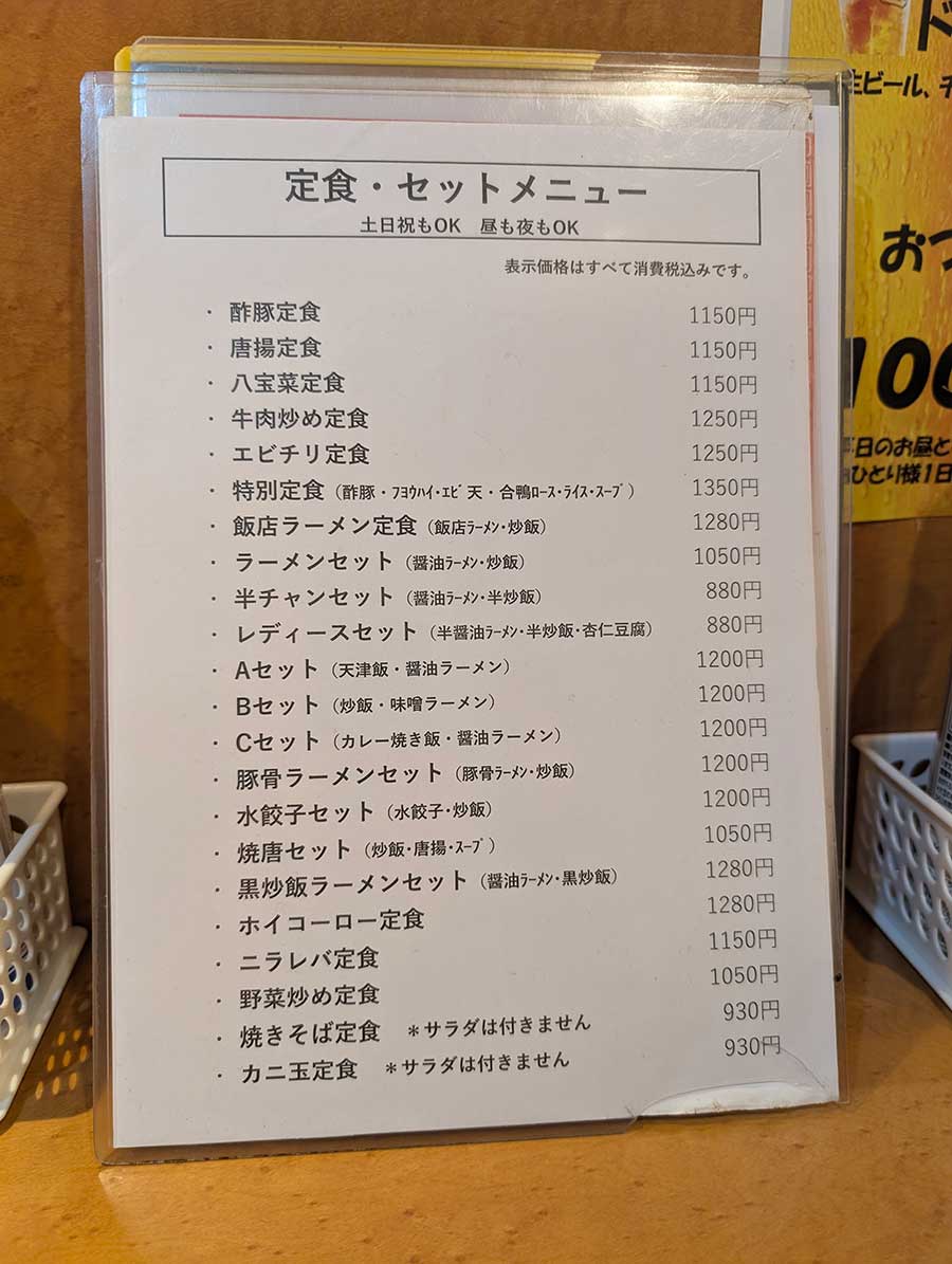 店内には単品メニューも豊富に揃っていますが、今回はお得な定食をいただくことに。カウンターに置いてあるメニューはどれも美味しそうで、選ぶのに一苦労。散々迷った結果、今回は「焼唐セット(焼飯・唐揚・スープ)」1,050円に決定しました。厨房から聞こえてくるリズミカルに鍋を振る豪快な音や、食欲をそそる香りをBGMに、料理の到着を心待ちにします。