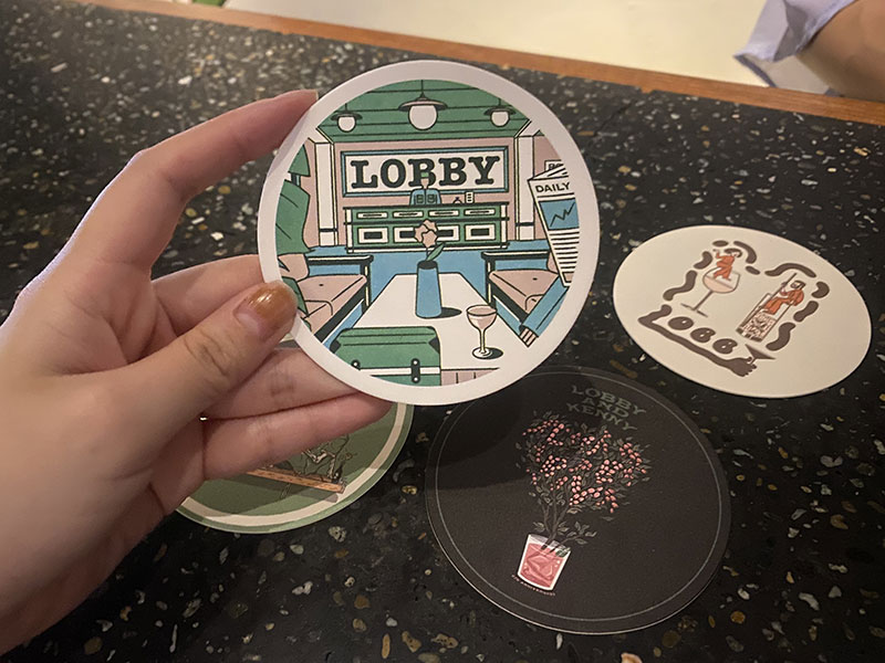 料理はもちろんですが、LOBBYの魅力は小物にも!オリジナルデザインのコースターはイラスト入りでとてもかわいく、思わず写真を撮りたくなります。こうした細部の遊び心も、訪れる楽しみのひとつです。