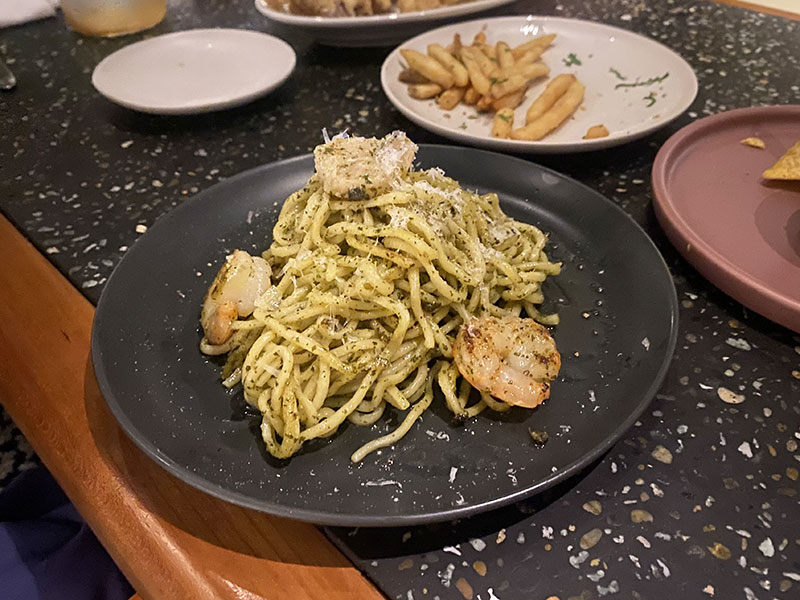 ぷりぷりのエビと香り豊かな大葉、そこにジェノベーゼソースが絡んだ一皿。パスタではおなじみのソースを焼きそばにアレンジしていて、驚きと美味しさが同時にやってきます。お酒とも相性抜群で、食べる手が止まりません。