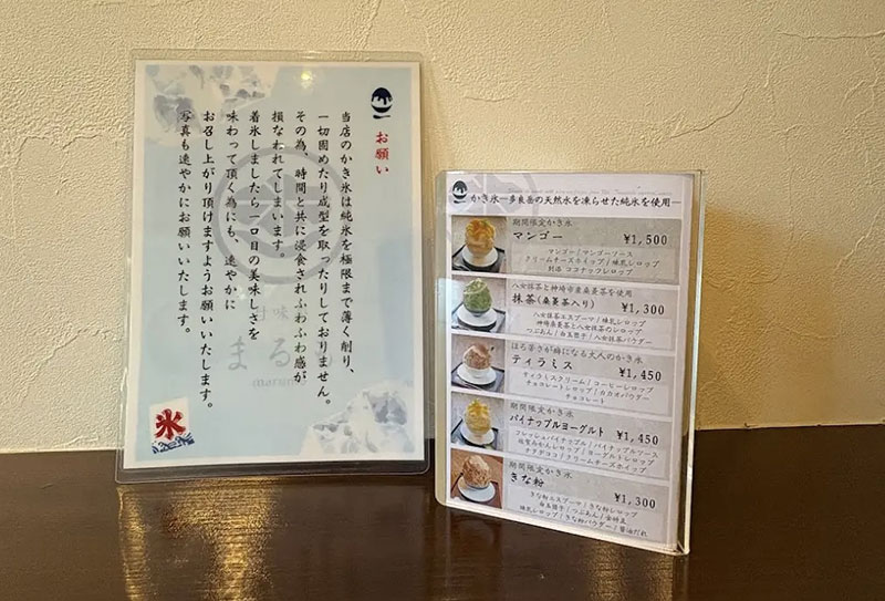 まるものかき氷は、マンゴーやパイナップルなどのフルーツを使ったものから、抹茶やほうじ茶、きな粉などを使った和テイストまでバリエーションが豊富です。全部美味しそうなので、どれにしようか本気で迷っちゃいます。ちなみに注文は一人ワンオーダー制でした。