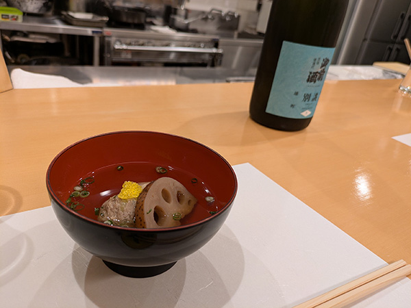 鰯のつみれのお吸い物です。合わせるのは御前酒「別誂」です。鰯の臭みが全く無く、旨味たっぷりのつみれとさっぱりした柚子を出汁と一緒に楽しみました!