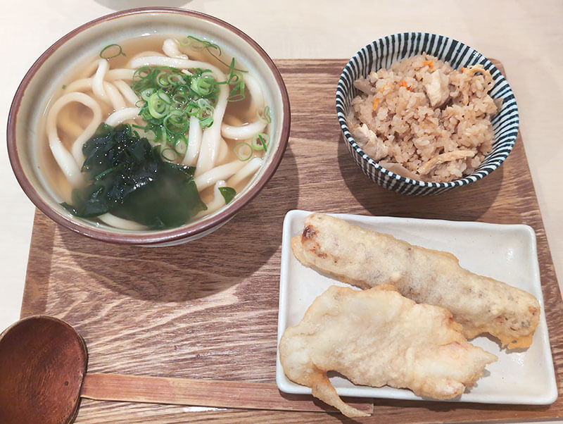 外は蒸し暑い28℃。本来なら冷たい麺を選びたいところでしたが、まずは名物を味わって店を知ろうと決め、うどん定食(名物とり天・ちくわ天/温かいかけうどん)を選択。ご飯ものは“濃厚卵かけ”と迷いましたが、鶏+鶏にしたいと思い、鶏天にさらに鶏ごぼうご飯に決めて着席。揚げ物の音と湯気が漂い、頬が自然に緩みます。