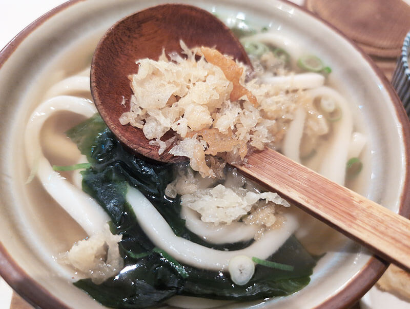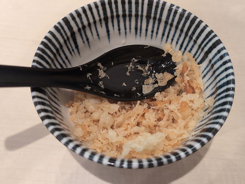 卓上には自由に使える天かすと黒七味が備えられています。[2] 半分ほど食べ進めたところで天かすを加えると、出汁に香ばしさと軽快な食感が生まれ、一気に別の一杯に変化します。さらに黒七味をひと振りするとピリッとした大人の刺激が加わり、心地よい余韻が長く残ります。うどん→ご飯→天ぷら→味変スープの無限ループに浸り、気付けば器も丼も空。胃も心も満たされ、「次は冷たい麺も試そう」と誓いながら店を後にしました。